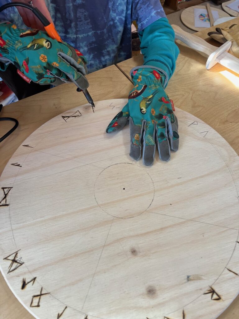 The children came to the “armoury” to select a sword and shield that felt beautiful and comfortable for them. We looked at and chose authentic shield designs, backed by archaeological evidence and are also selecting colours that were used on shields at this time. Adding to the excitement we are using wood burning to burn runes onto both sword and shields. Children are selecting what they want to say and translating this into runes, so everyone’s designs are unique, meaningful and personal.
