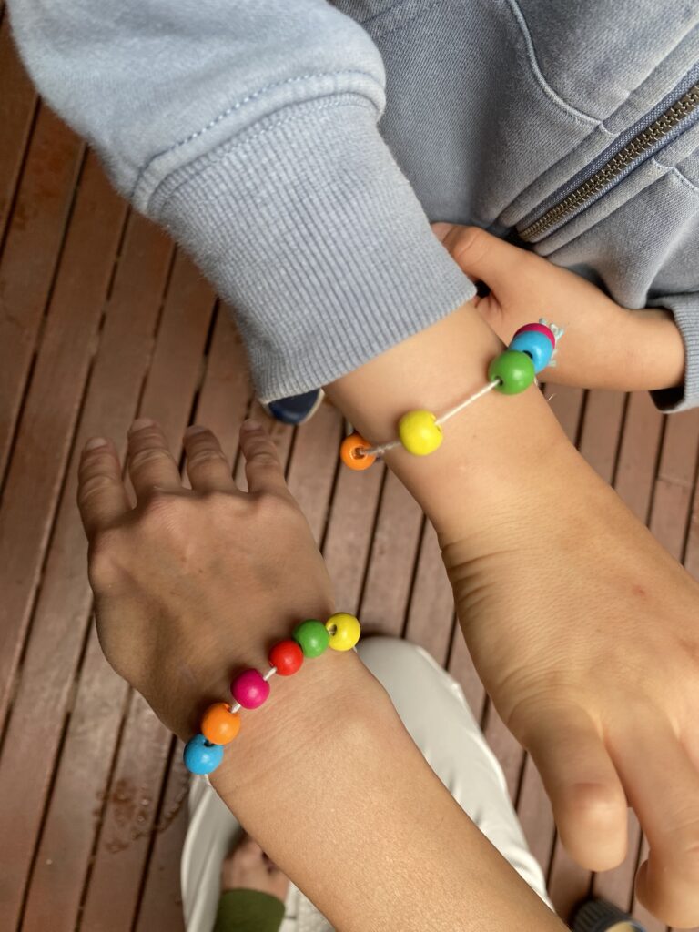 Class 1/2 read the story Our Class is a Family and our Restorative Practice lesson this week. We discussed the values that contribute to a friendly and cohesive environment. Together the children made friendship bracelets, threading beads: red for kindness, orange for respect, yellow for being ourselves, green for being different, blue for sticking together and magenta for working hard. Our bracelets will help us to remember we will learn and grow together.