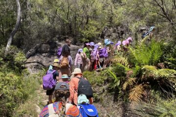 As part of our studies, the children went on a day trip to the Charles Darwin Walk in Wentworth Falls. They searched for one of the rarest trees in the world, Eucalyptus copulans. We came to a Hanging Swamp, which was cool, wet and full of life, despite being threatened. We saw a Tiger Snake resting in the sun along the track and paddled in one of the Jamison creek rock pools.